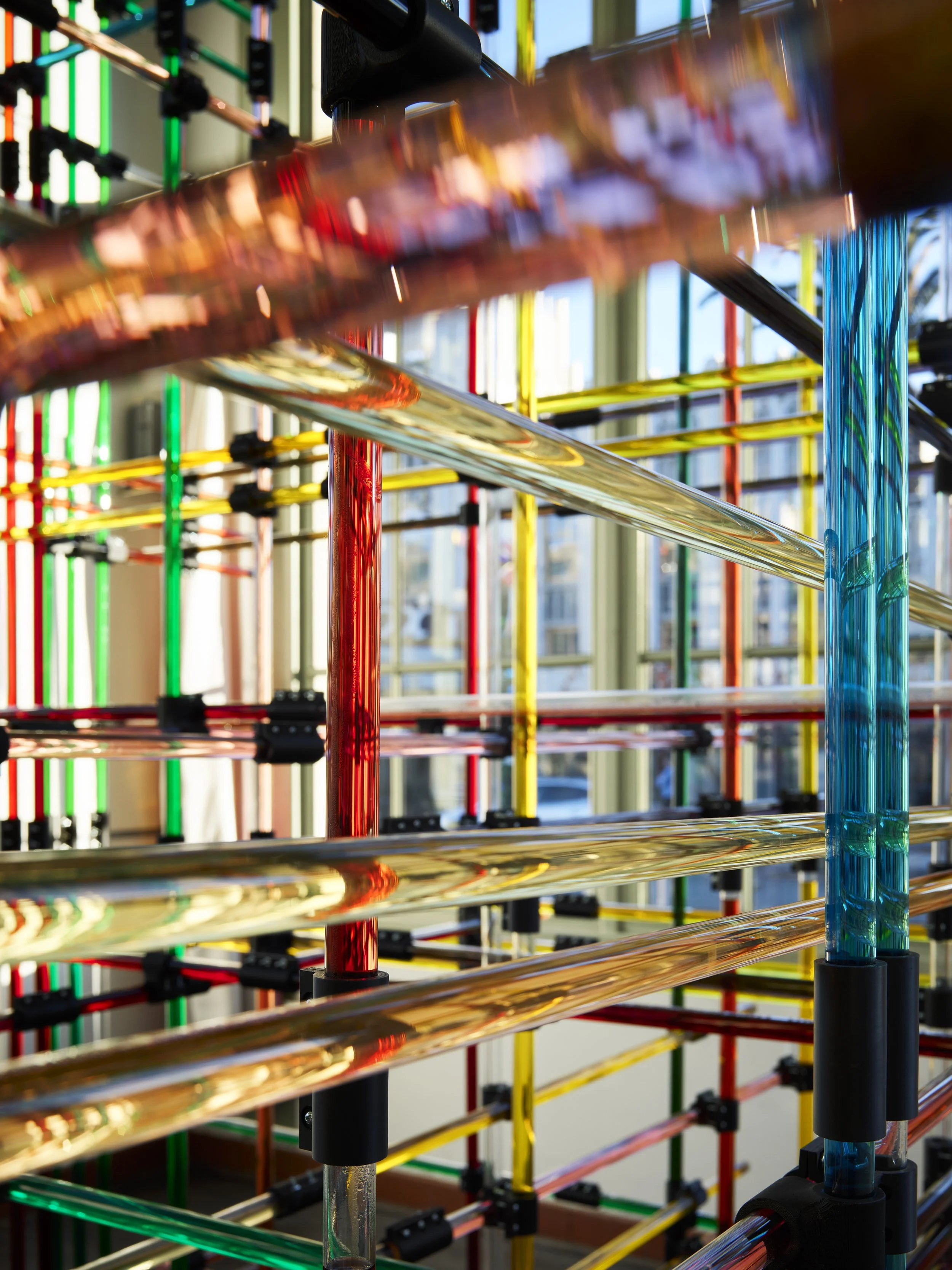 PLAID is an interior art installation that conflates Silicon Valley's agricultural history with the region's contemporary technological focus. The PLAID structure is composed of 300 state-of-the-art recycled glass rods connected by 3D-printed nodes. The glass rods are filled with cabernet, zinfandel, and chardonnay wine from the region, as well as colors that represent the spinach, turmeric, and oyster mushrooms which are some of the most prolific crops grown in Santa Clara County. The colorful rods are woven together to create a 3-dimensional plaid structure that brings together the culture of the past and the present, high-tech and low-tech materials, to create special effects using liquid and light.