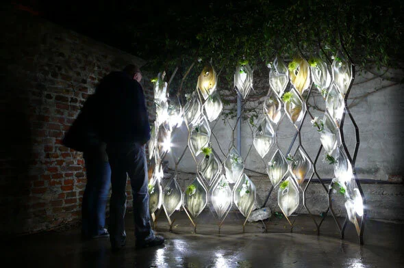Borrowing from this rich history, The Night Garden is a vertical landscape built of glowing porcelain tiles within a steel structure supporting translucent vessels designed to hold water and flowers such as evening primrose, moonflowers and brassavola. The flowers were chosen due to their fragrant nature and night blooming characteristic. The installation references the traditional construction material, such as wrought iron, brick, tile, the intentional placement of water, and the historic relevance of fire, all while highlighting the exotic plant life of New Orleans.